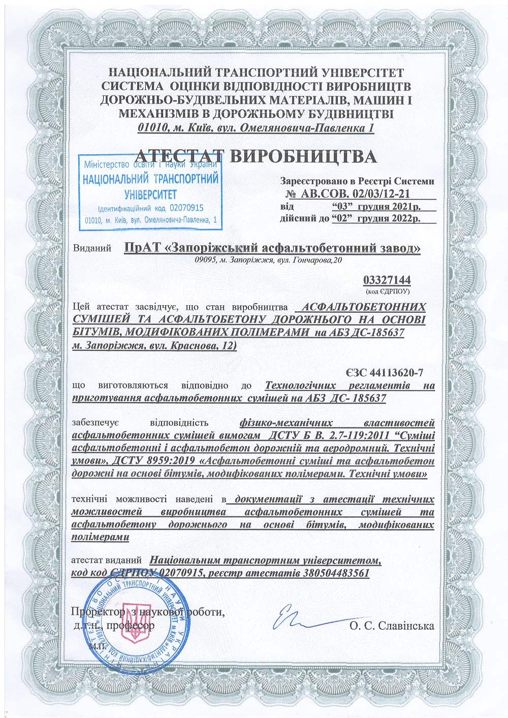 На ПрАТ «Запорізький асфальтобетонний завод» змонтовано дві установки для модифікації бітуму полімерними матеріалами, адгезійними добавками, завдяки чому завод може виробляти асфальтобетонні суміші за найсучаснішими технологіями.